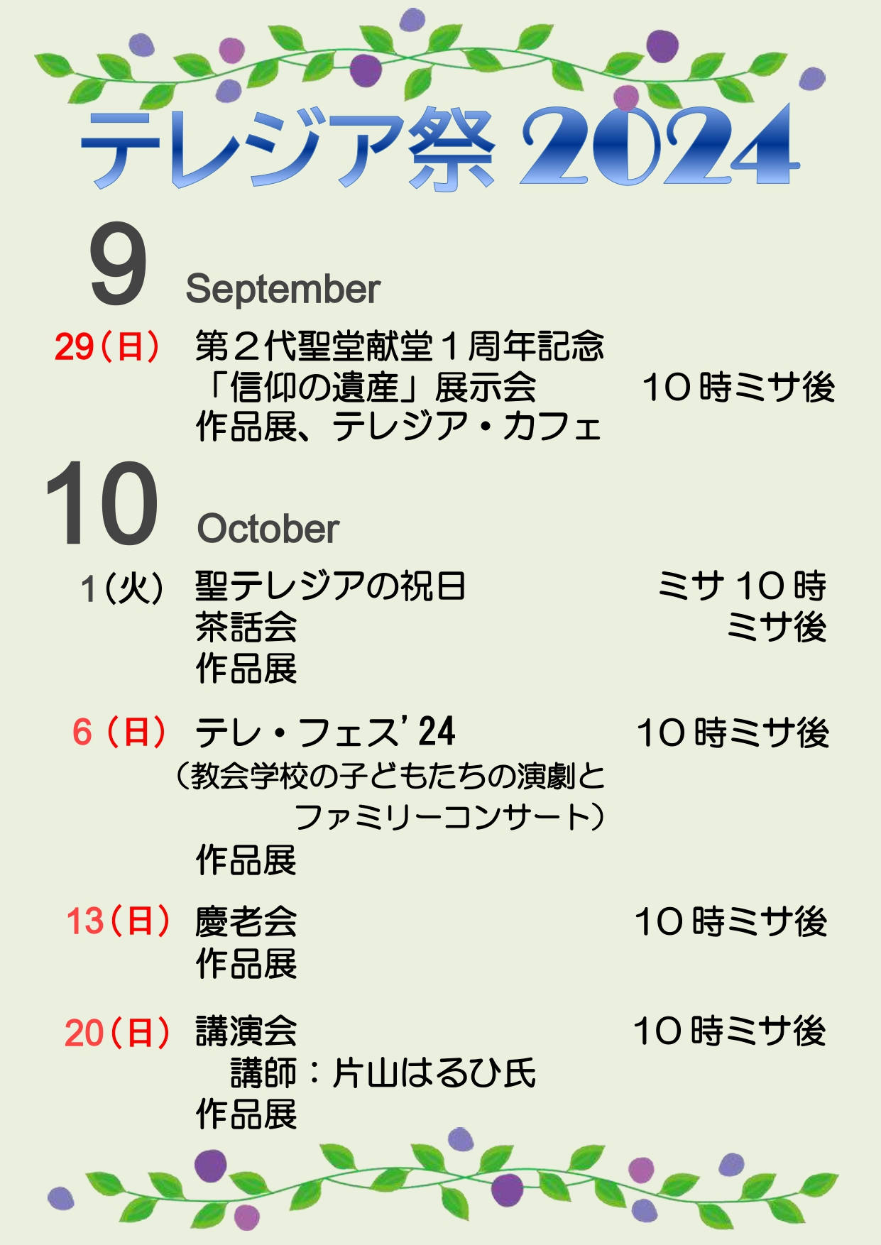 「作品展」「信仰の遺産展示会」「テレジア・カフェ」 10時ミサ後
