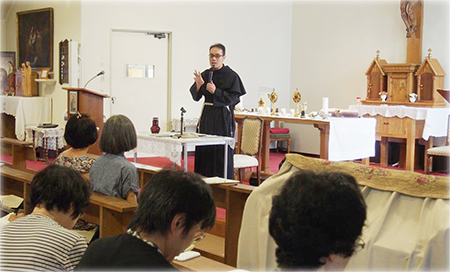 講師は、コンベンツアル聖フランシスコ修道会の山口雅稔神父様。同会の関町修道院・修練院・志願院の院長を務めておられます(1971年生まれの44歳)。コルベ神父について、その殉教の日である8月14日にお話しできることは大変な喜びと語られました。前半ではコルベ神父の生い立ち、後半ではその霊性を紹介するという、同じ修道会の霊性を生きられている若い神父様のお話は温かく、力みなぎるものでした。最後の質疑応答、感想発表でも参加者の手が次々とあがり、活気あふれる分かち合いとなりました。