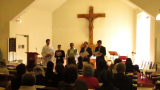 堅信式の後は、テレジアホールでお祝いパーティ。堅信を受けた皆さんに記念品が贈られ、司教様にも感謝の「花よりワイン」。