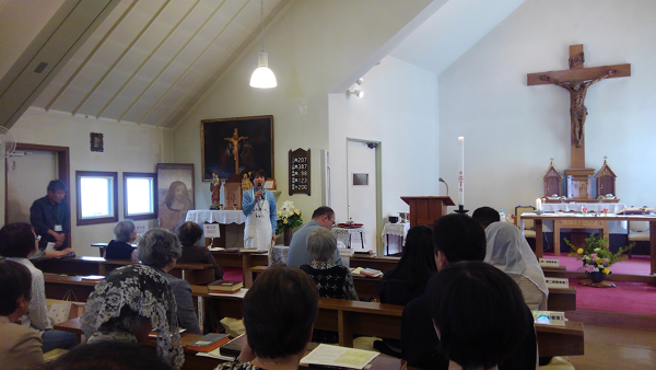 ミサの終わりには、養成担当の大山神父様とともに来られた5名の神学院初年度生の方々、そして偶然同じ日に来られたコンベンツアル聖フランシスコ修道会の谷崎神父様と2名の神学生の方々が紹介されました。