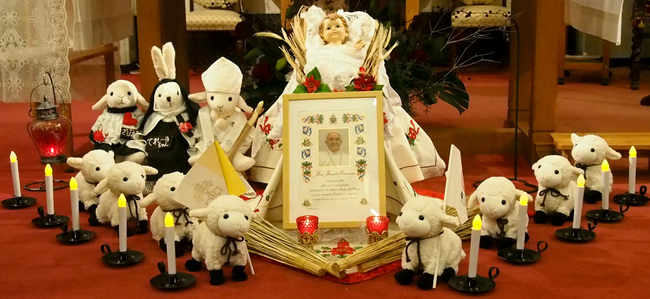関町教会では、主の降誕のとき、祭壇前にはいつも「てれーずちゃん」、「ざびえるくん」、そして「パパ様」をかたどったオリジナルのぬいぐるみが供えられます。今年はその中心に教皇フランシスコの来日記念祝福カードの写真があります。12月24日と25日は奇しくもその教皇来日(11月23日夕方~26日午前)からちょうど1ヶ月。稲川神父様は東京ドームのミサでの祭服を再びまとい、あの来日の意義をご降誕の福音に重ねて語り、教皇の祝福のことばをあらためて告げました。