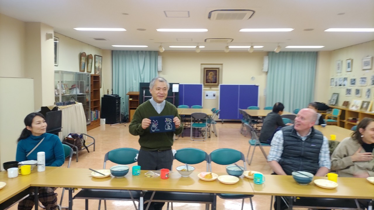 食事が一段落したところで、3月19日が聖ヨセフの祝日でしたので、福田神父様の霊名の聖人「聖ヨセフ様」のお祝いをしました。福田神父様からはヨセフ様について短いお話のあと、四旬節ですが、お祝いに皆でロールケーキを食べました。そして、神父様に手作りブックカバーのプレゼント。「Joseph」と刺繍が入っています!福田神父様もお喜びくださって、皆もほっこり。子ども達の中にもヨセフ様のご加護をいただいているお友達が1名いました。女の子ですので「ジョセフィーヌ」さんです。福田神父様は本当にヨセフさまのようですね。