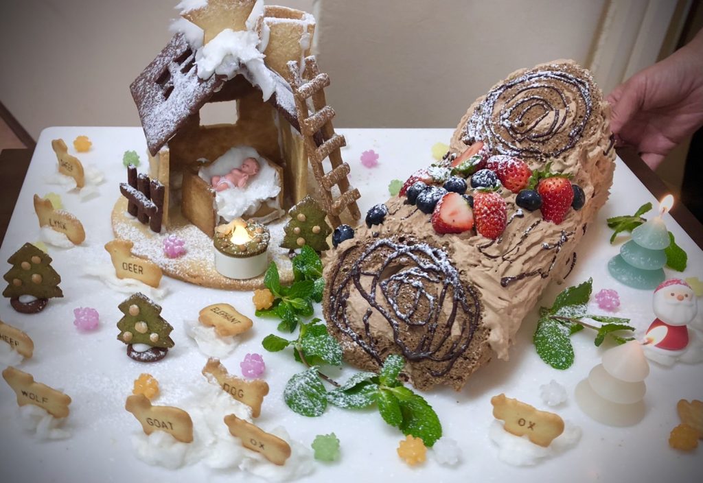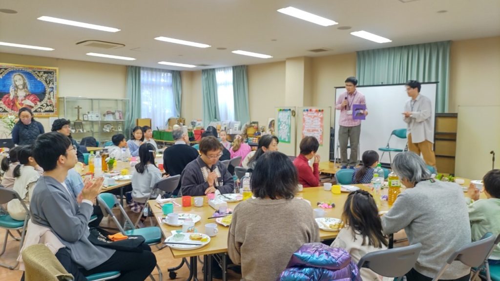 クリスマス会 活動 2023.12.21 12月17日(日)アドベントのばら色のろうそくに明かりが灯りました。10時のミサ後、子どもたちや神父様、予科生、合わせて42名がテレジアホールに集まり、賑やかにクリスマス会が行われました。 福田神父さまのおはなし 予科生お二人による絵本「三本の木」のよみきかせ 手づくりケーキ!かわいいイエスさまが眠っています